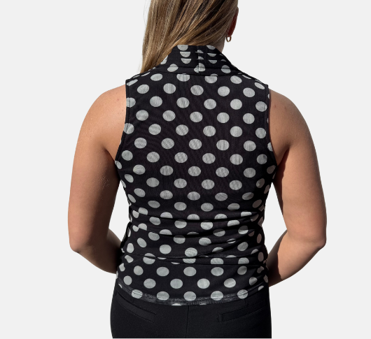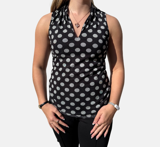 Iris - Polka Dot Mesh Sleeveless Pleated V-Neck Top in Black