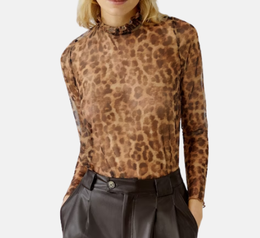 Oui - Mock Neck Animal Print Sheer Top in Camel and Grey