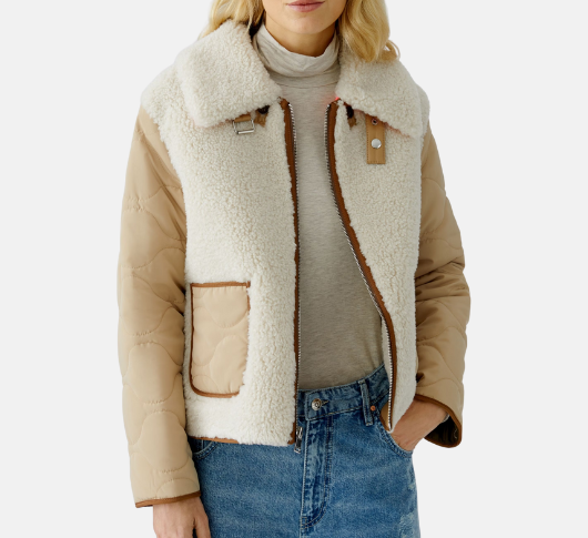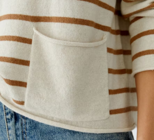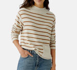 Oui - Mock Neck Striped Sweater with Front Pocket in Off-White and Camel