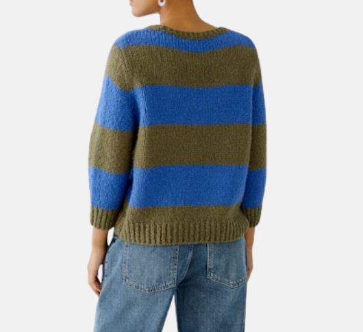 Oui - Stripe Sweater with 3/4 Sleeves in Khaki and Blue